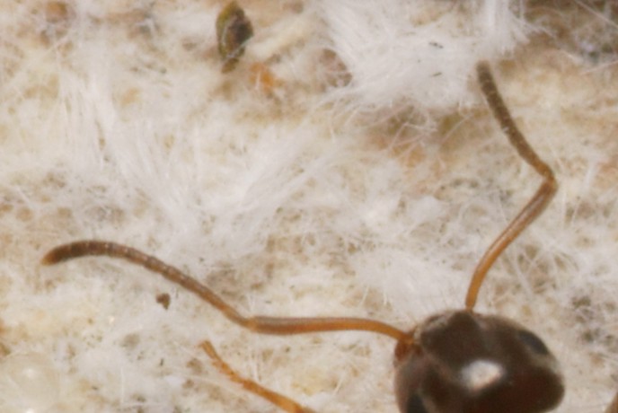 Nom de l'image : DSC11149R2-b069-069r49.2 - .. .. (fourmis) [Formicidae - Hyménoptères] - ouvrière (3,5 mm) cohabitant avec des larves de Cixidia .. [Achilidae - Homoptères] - site VL2 (chêne abattu ; maquis à l'ubac) Nombre consultations : 379